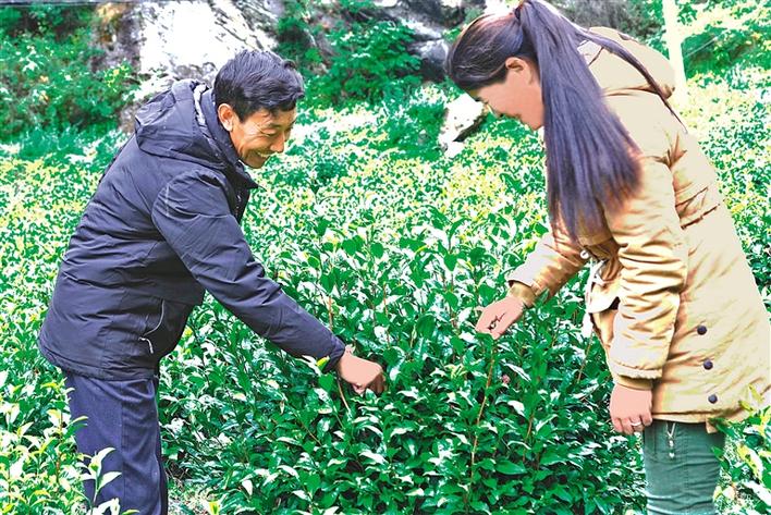 圖為勒門(mén)巴民族鄉(xiāng)茶葉農(nóng)牧民專(zhuān)業(yè)合作社理事長(zhǎng)羅布次仁(左)和技術(shù)指導(dǎo)達(dá)娃卓瑪在查看茶葉長(zhǎng)勢(shì)