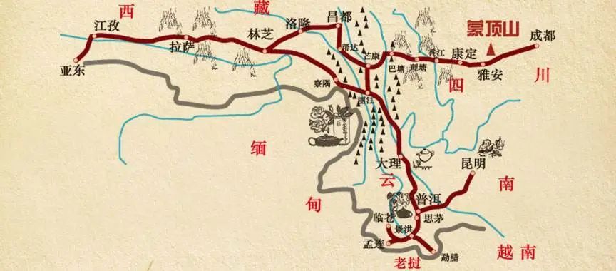 之后,順其自然地就出現(xiàn)了滿足這種貿(mào)易形式的貿(mào)易通道。古代交通方式有限,“馬幫”就成了為交換“馬匹”和“茶葉”貿(mào)易提供服務(wù)的運輸商。隨著“茶馬互市”規(guī)模的擴大,一條條古道被相繼探索發(fā)展出來,隨著歷史的發(fā)展,人們逐步將這些道路統(tǒng)稱為了“茶馬古道”,一個聽起來還有點浪漫的名字。