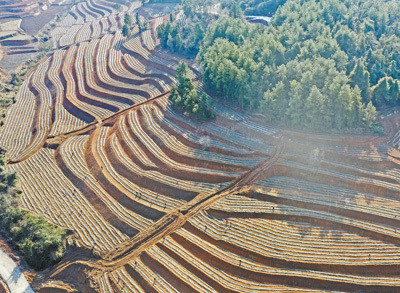 圖為日前,當(dāng)?shù)亟?jīng)過(guò)整治并種上茶樹(shù)幼苗的石漠化土地。