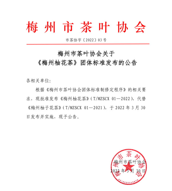 梅州市茶葉協(xié)會關(guān)于 《梅州柚花茶》團體標(biāo)準發(fā)布的公告