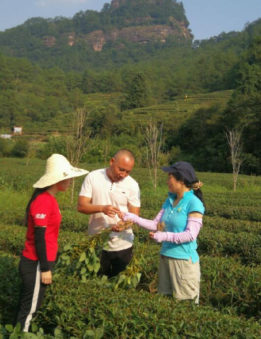 為探索茶園高效、生態(tài)、環(huán)保建設模式,福建農(nóng)林大學根系生物學研究中心主任廖紅與團隊走進星村鎮(zhèn),把高效豆科作物提高茶樹的養(yǎng)分利用效率,并達到減肥增效等科研成果,運用到茶葉基地建設,以提高茶葉的產(chǎn)量及質(zhì)量。廖紅教授認為,茶豆套種作用明顯,大豆可產(chǎn)生根瘤菌,具有固氮作用,增加土壤肥力,茶園里套種大豆可少下或不下氮肥。同時,金龜子、蚜蟲等更喜歡大豆葉子,從而減少茶樹蟲害。還能增加茶葉產(chǎn)量,實驗表明,靠近大豆的茶樹每平方米可長出190個芽梢數(shù),比沒有靠近大豆的茶樹多出一倍。